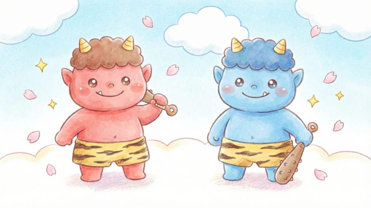 節分の赤鬼と青鬼を子供にも親しみのある可愛らしいイラスト画像です。